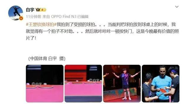 王楚钦球拍事件发生后,中国记者白宇在社交媒体上发布了一张照片,清晰地显示了球拍皮肤脱胶的细节,成为关键证据。从图中两个球拍的对比来看,另一个球拍的胶水已经明显撕裂。