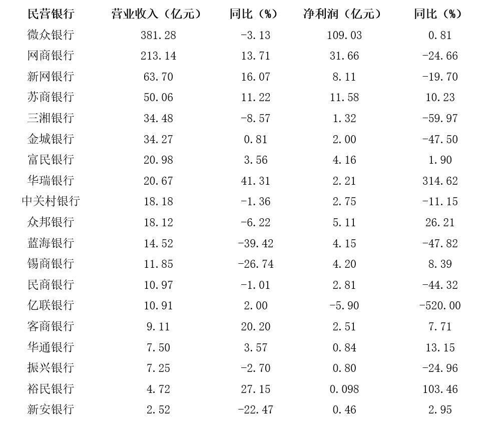 从财务数据来看,19家民营银行的经营效益呈分化趋势。6家银行完成了业绩的“双增长”,分别是苏联商业银行、富民银行、华瑞银行、商业银行、华通银行和裕民银行。相比之下,三湘银行、蓝海银行、民营银行、振兴银行和中关村银行的净收入较去年有所下降。