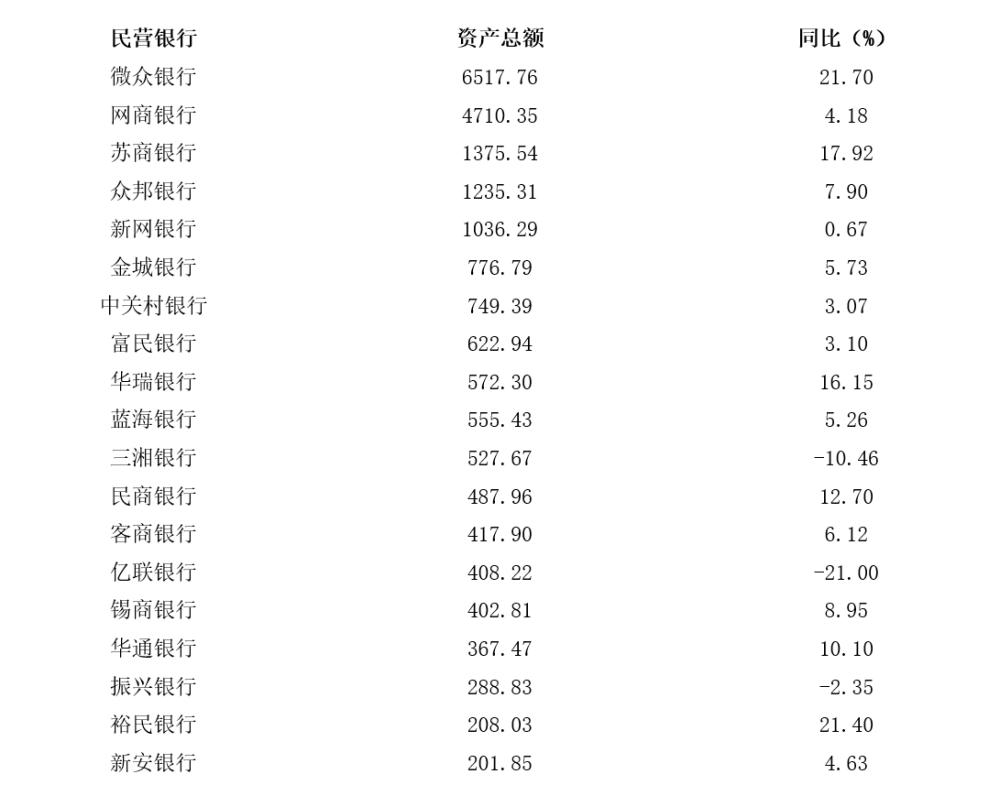 就增长率而言,亿联银行、三湘银行和振兴银行的资产规模缩小,比去年下降了21.00%。、其它16家银行的资产规模均有10.46%和2.35%的增长,其中,微众银行、裕民银行增长迅速,分别为21.70%和21.40%,苏商银行、华瑞银行、民商银行和华通银行也实现了两位数的增长,17.92%的增速分别为17.92%、16.15%、12.70%和10.10%。
