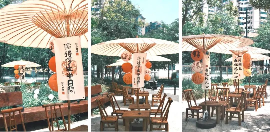 几乎所有的店铺都有足够的户外空间,搭配不同的选址和设计风格,营造出不同的茶感。三坊七巷的三家店,营造了在坊巷喝茶的市场感;烟台山店主推着在公园喝茶的慵懒感觉,“偷半天闲”;上下杭店就像一个位于古村落的茶室&展室...