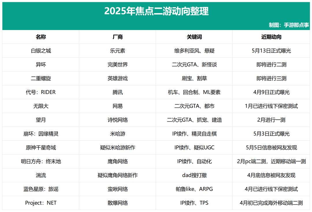 面对这种难以进入、不敢进入的情况,二游市场迫切需要更多的潜在、全新的高标准产品。但是这种情况真的有可能发生吗?有些,有些。在这里,笔者还整理了一份今年两游重点的动态表格,供大家参考。