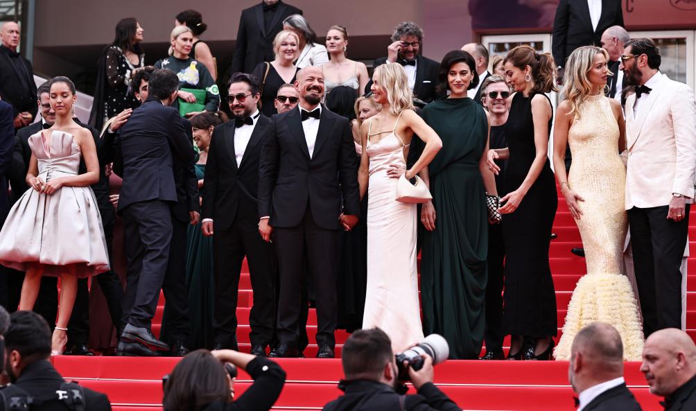 u2003u20035月19日,瑞典导演塔里克·萨利赫(前右二)在法国南部小镇戛纳举行的第78届戛纳电影节上,在主要竞赛单元电影《共和之鹰》首映后与创作人员离开。新华社记者 高静 摄