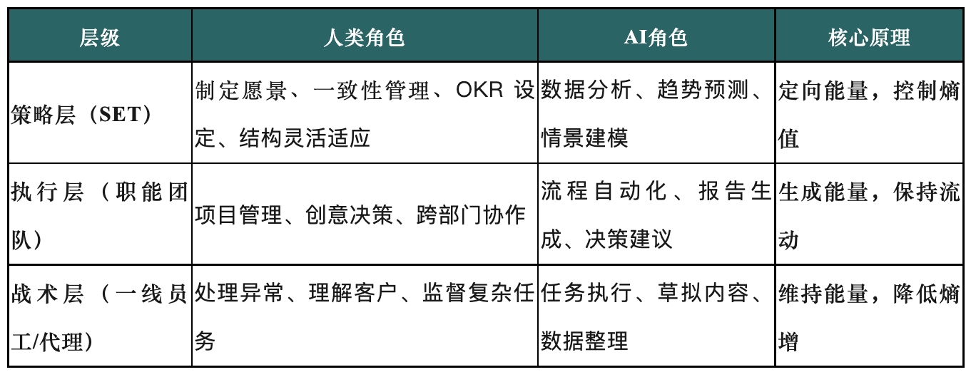 因为人工智能不仅改变了执行任务的方式,而且重塑了公司内部能量流动和决策机制的关键结构。信息流、责任归属和行动效率在 AI 加入后变得更加复杂甚至混乱。然而,许多组织仍然使用工作部门分割和垂直决策链的旧结构——当需要快速响应和明确合作的关键时期时,这种结构只会放大混乱,加速熵增长。