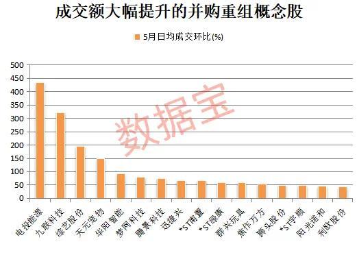 根据交易情况,据数据宝统计,截至5月19日收盘,5月至今日,24只并购概念股平均成交额环比增长20%以上。
