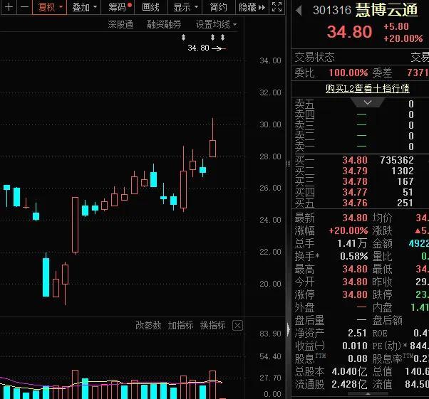 5月20日开盘,慧博云通(301316)开盘走高,日线涨停一度超过90万手。截至中午收盘,公司股价收于34.8元/股,创2024年至今新高,日线涨停超过73万手,a股市值突破140亿元。
