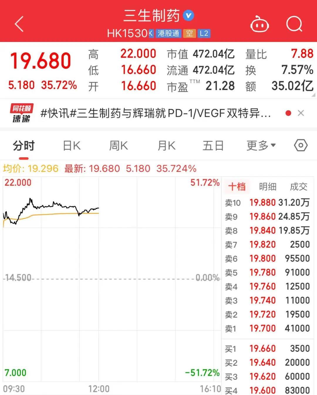 三生国健早晨“20CM”涨停,迎来两连板。三生制药在港股上涨35.72%。