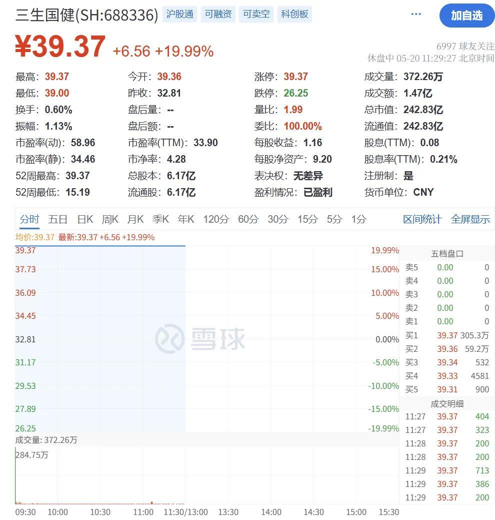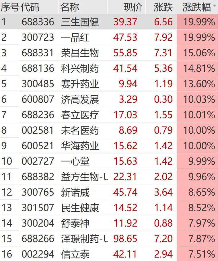 5月20日上午,医药生物板块强势上涨,医疗美容、创新药品等概念股持续上涨。个股方面,三生国健、一品红涨停20cm,济高发展、未名医药、华海医药、一心堂涨停,荣昌生物、科兴制药、赛升药业涨停10%以上。