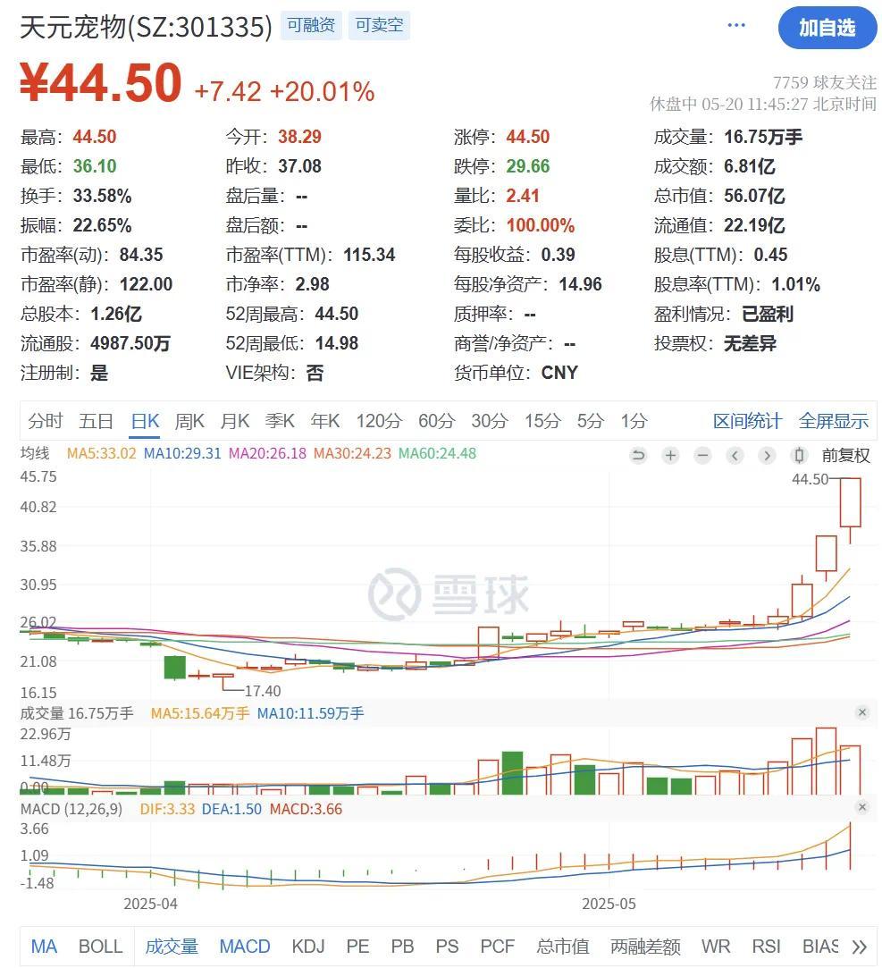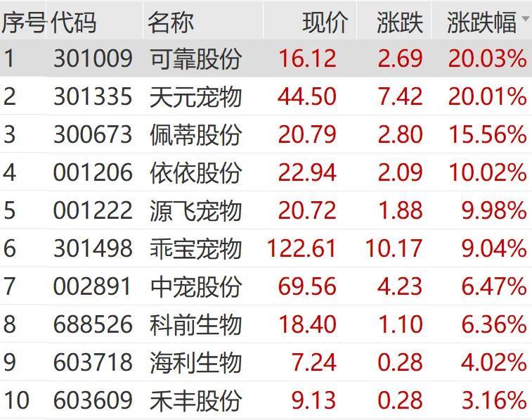 宠物经济概念股大幅上涨,天元宠物连续两天涨停20cm,创历史新高,源飞宠物等涨停。