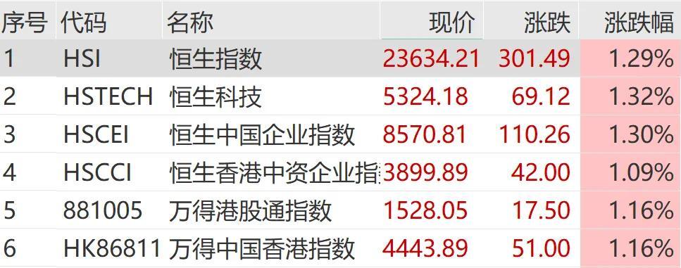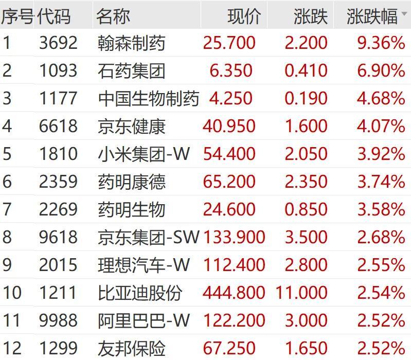 港股市场午前同步上涨。截至中午收盘,港股三大指数均涨幅超过1%。;翰森药业涨幅超过9%,领涨恒指成分股。