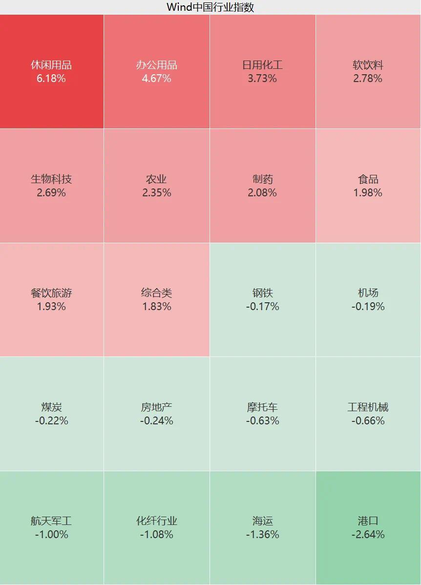 行业方面,大消费普遍上升,休闲用品、办公用品、美容保养、宠物经济、创新药品、食品等领先;港口、航运、化纤等行业领先。