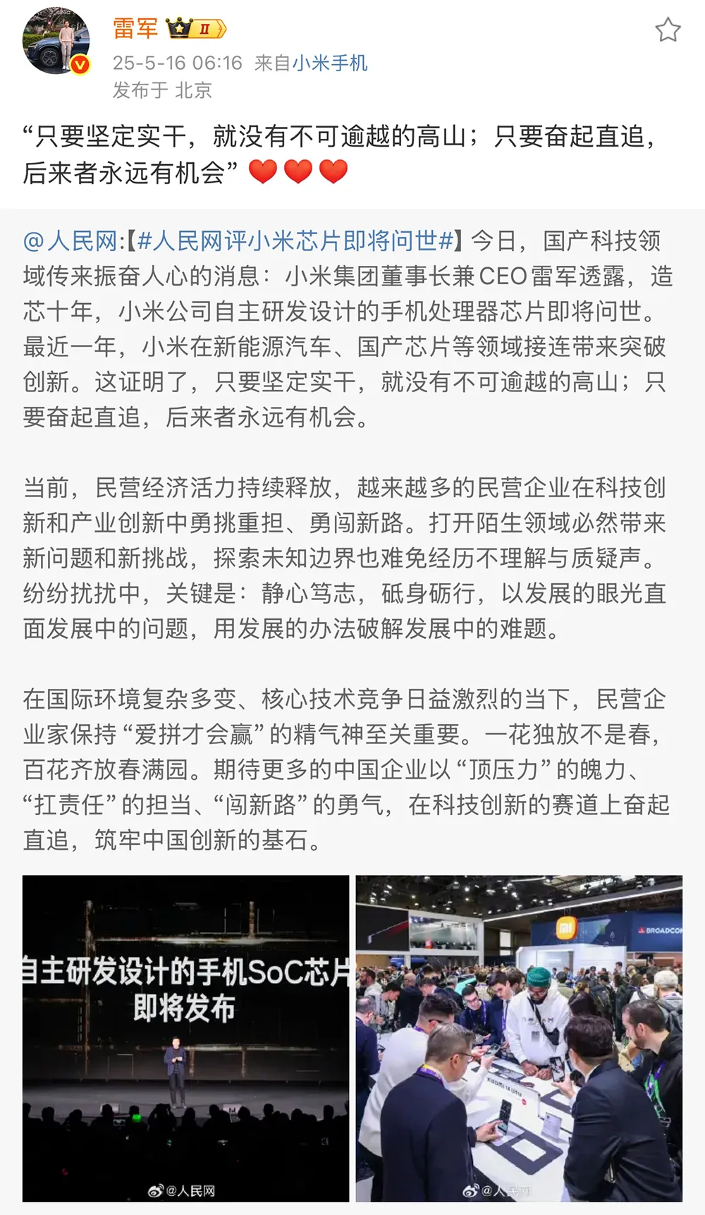 第二天,雷军一大早6点转发了人民网评论小米芯片即将问世的微博,并写了一条评论让小米芯片振作起来:“只要你努力,就没有不可逾越的大山;只要你追上去,后来者总有机会。❤❤❤”