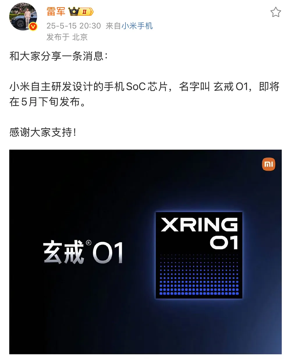 周四5月22日晚,小米玄戒O1将发布,雷军将于上周四5月15日开始密集发布微博预热。