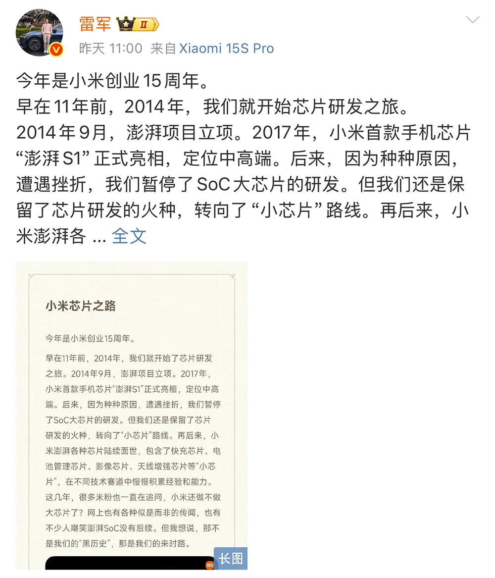 雷军写道:“我相信,这一规模,在目前国内半导体设计领域,无论是R&D投资还是团队规模,都位居行业前三。