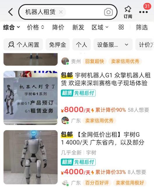 2025年2月中旬,上述产品首次在JD.COM销售。在二手交易市场,宇树G1掀起了一股租赁热潮,标注“春晚同款机器人租赁”、“宇树机器人”等字样的租赁商家大量涌现。人形机器人商品的日租金从几千元到几万元不等,租赁用途广泛,包括商演、科普宣传、开业迎宾等场景。