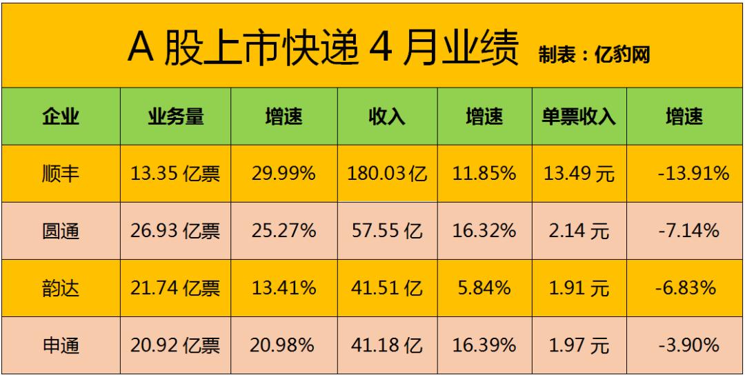 亿豹网发现,除了2月份春节的影响外,在今年公布的四个月业绩中,顺丰快递已经领先三个月的增长率,显示出强劲的增长势头。