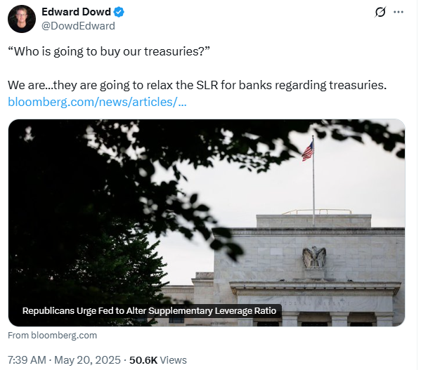 美国债券的暴跌引起了业界对政府救市的预期。然而,银行担心最终会接管自己。周二,前贝莱德基金主管和资深华尔街投资者Edward Dowd表示: