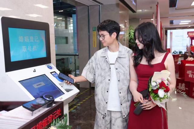 “‘碰一下’结婚。今天来领证的新人,不仅可以‘碰一下’更方便的办理结婚登记,还可以获得创造性的老年祝福,刻录新婚誓言。西湖区民政局工作人员介绍,在提高结婚登记便利的同时,也希望为新人创造更多的仪式感,记录人生的幸福时刻。