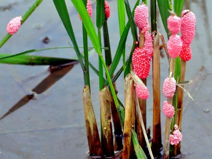 五月至八月,是福寿螺繁殖的高峰期,所以到处都是粉红色的螺卵。每年可产卵20~40次,每年可产卵3~5万粒。