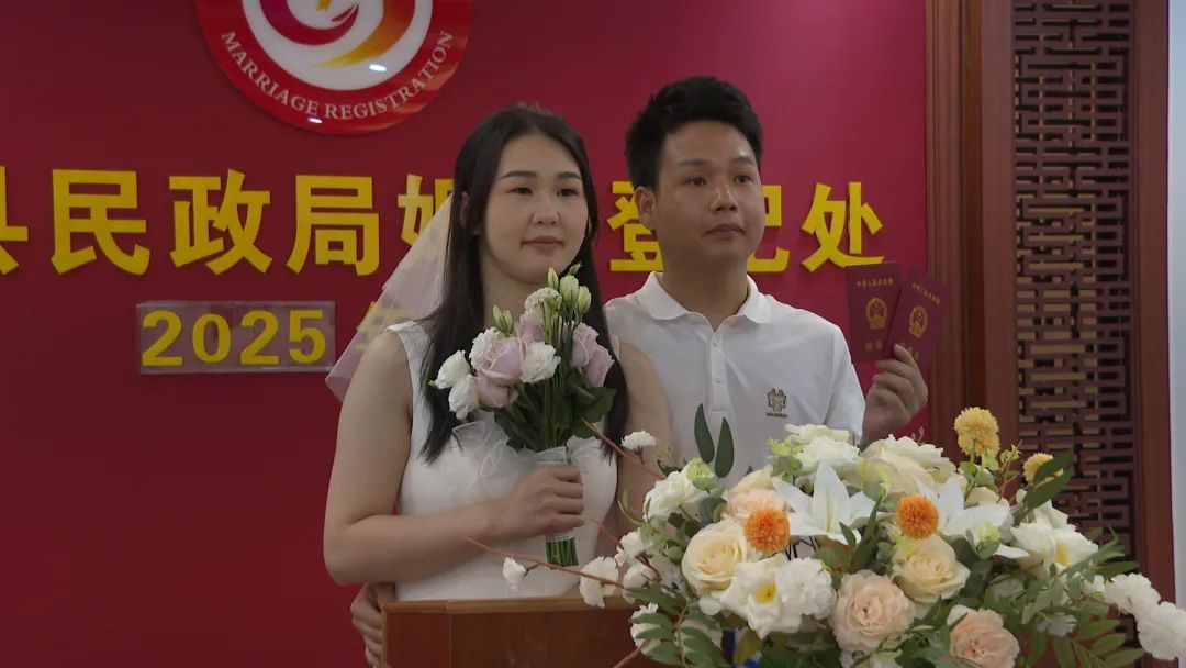 走进龙川县民政局婚姻登记处大厅,犹如走进一片甜蜜浪漫的海洋,现场充满爱意。来登记结婚的新人,脸上洋溢着幸福的微笑,空气中弥漫着喜悦和期待的气氛。一对夫妇在亲朋好友的陪伴下,手持鲜花,身着精心搭配的服饰,迎接人生的重要时刻。“今天是个好日子,因为是‘520’,很有纪念意义,意思是我爱你,爱你一辈子。我希望我们将来会越来越好。”新人叶尧强望着身边的妻子说。"在一起三年了,因为这一天很容易记住,很浪漫,‘520’我爱你。我觉得平平淡淡很好,没有其他的波折,平平淡淡很好。”新手钟美枚说。