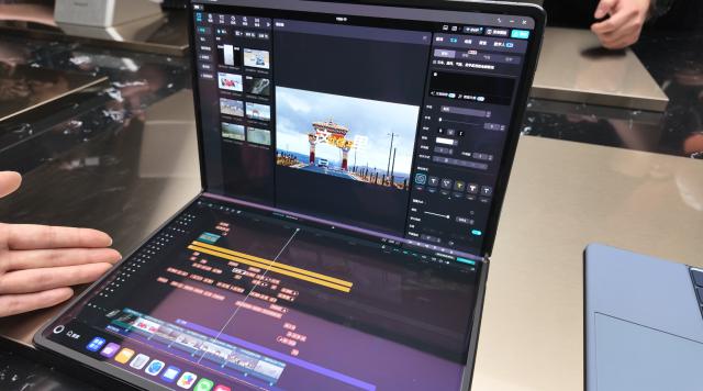 要是你想用鸿蒙 PC 剪影和万兴喵影剪视频,用起来和之前的电脑不一样。比如现场体验区可以看到,上半部分只有素材和浏览,下半部分是用来编辑的。