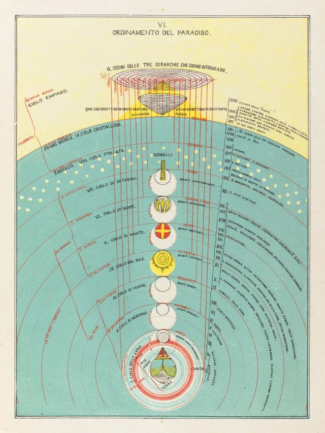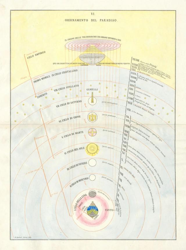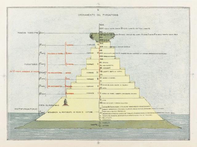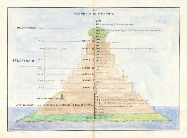 几个世纪以来,这种学术传统不断延续,最终使米开朗基罗成功。 · 凯塔尼(Michelangelo Caetani)巅峰之作。他制作了一系列地图和图表,并选择了“但丁 · 阿利吉耶里的神曲:六幅图片描述(The Divine Comedy of Dante Alighieri Described in Six Plates)。此书分别在 1855 年与 1872 年度出版,前者为手绘石版画,后者为蒙特卡西诺修道院(Monte Cassino)一批僧人选择了最初的彩色石印技术印刷。