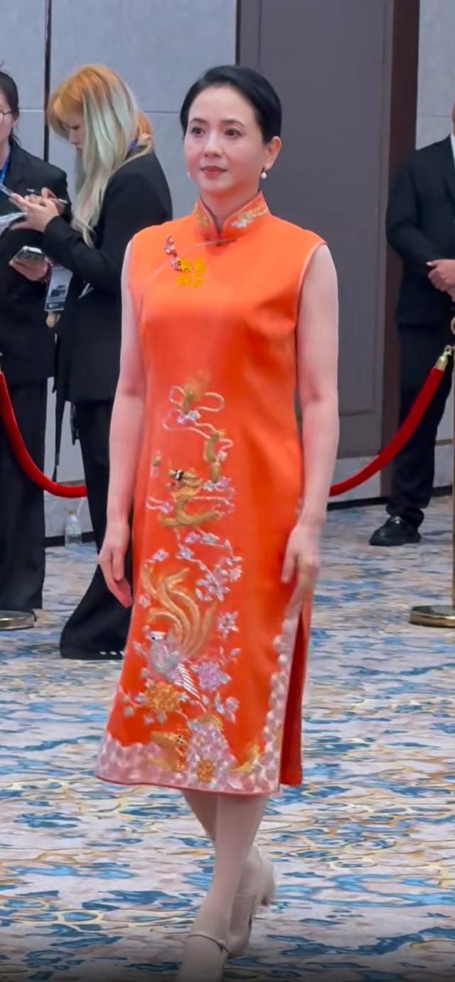 陶慧敏穿着一件不容易驾驭的橙色刺绣旗袍,在她身上却能凸显出皮肤白皙美丽的优点,优雅中透着一种温柔。