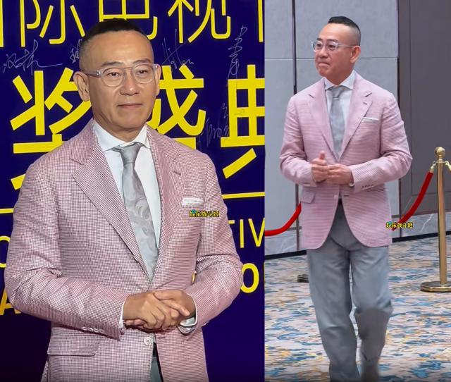 林保怡穿着一件粉色格子西装外套搭配灰色裤子,生图中可以看到他脸上已经有了比较明显的岁月痕迹,但是五官变化不大。