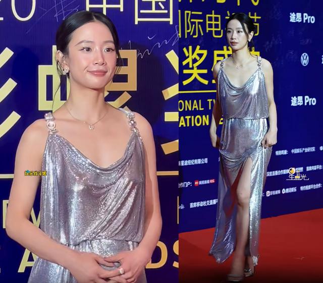 李梦的银色连衣裙也是高开叉设计的,但是因为裙子本身比较宽松,如果搭配长卷发,应该会表现出慵懒随意的氛围,所以组合头发就没那么好了。