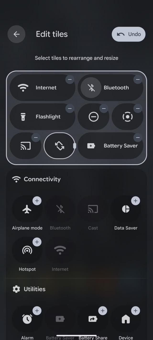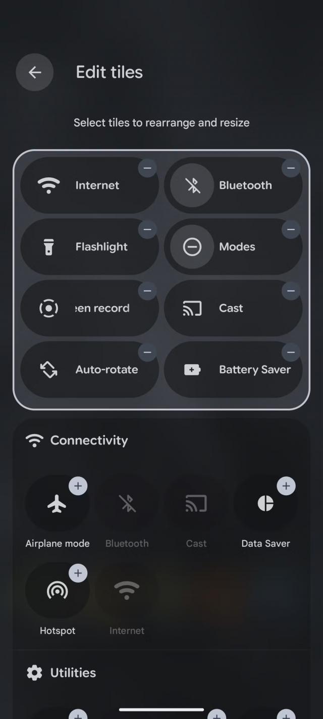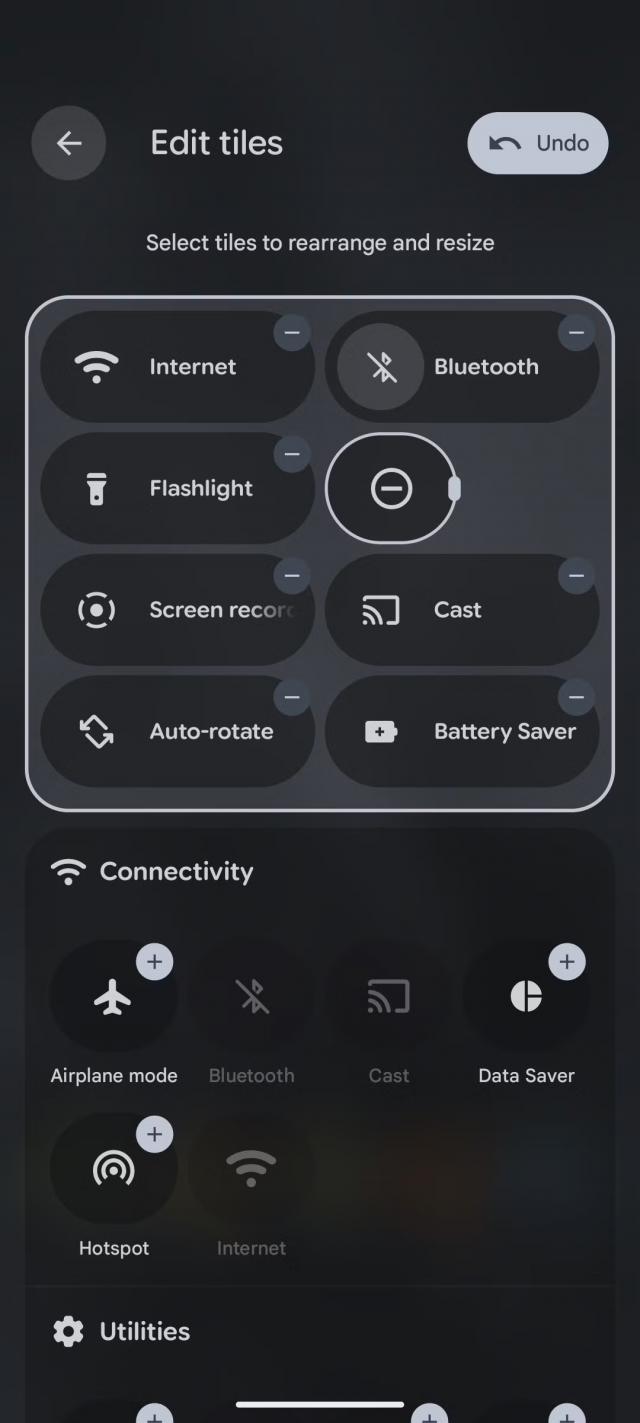 用户可以通过熟悉的编辑模式(点击铅笔图标)调整选项大小。点击随机快速设置选项后,他们可以显示可拖动的控件,并将其从 2x1 调整到较小的 1x1 布局。IT 这个家庭的另一张截图如下: