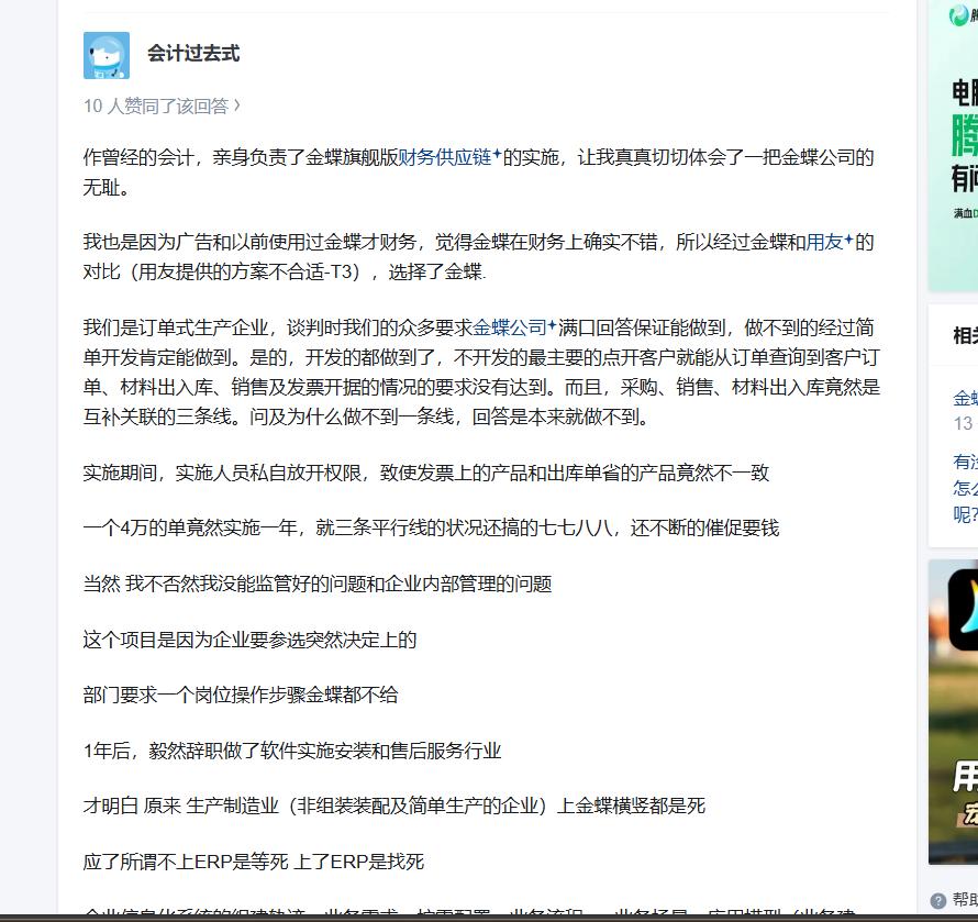 一位名叫“会计过去式”的网友在知乎分享说,他亲自负责实施金蝶旗舰版的财务供应链。金蝶在金融方面确实不错,但他根本做不到生产企业同意的事情。