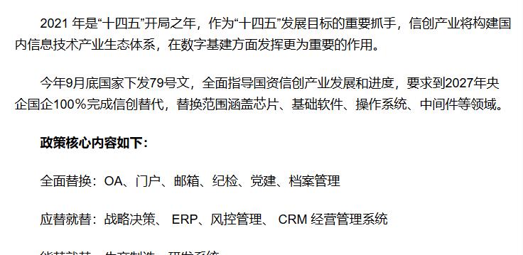 一方面,2020年,基于对核心技术“卡脖子”的焦虑,政策要求央企国企在2027年100%完成信创取代,包括企业管理系统、运营系统、芯片等领域。