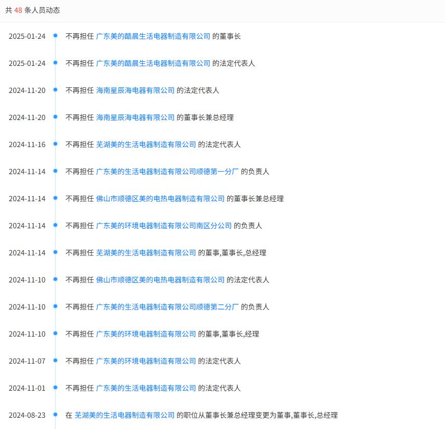 天眼查显示,自2024年11月至2025年1月底以来,徐邈锋已卸任法定代表人、董事长等10余家美国公司的高级职务,目前仅担任广东美的卡菲咖啡机制造有限公司法定代表人、董事长、总经理。