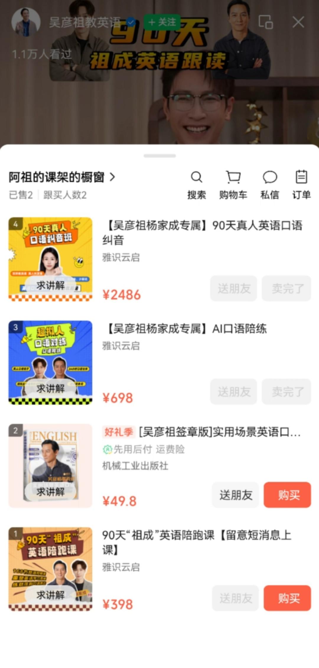 当晚,吴彦祖在“吴彦祖教英语”直播间带来了自己的英语课程产品。橱窗上的产品包括90天的英语陪跑课(售价398元,包括84节吴彦祖情景实战课和84节认知方法课),由英语教育博主杨家成(拥有3000多万粉丝)合作。、《实用场景英语口语》(售价49.8元)。