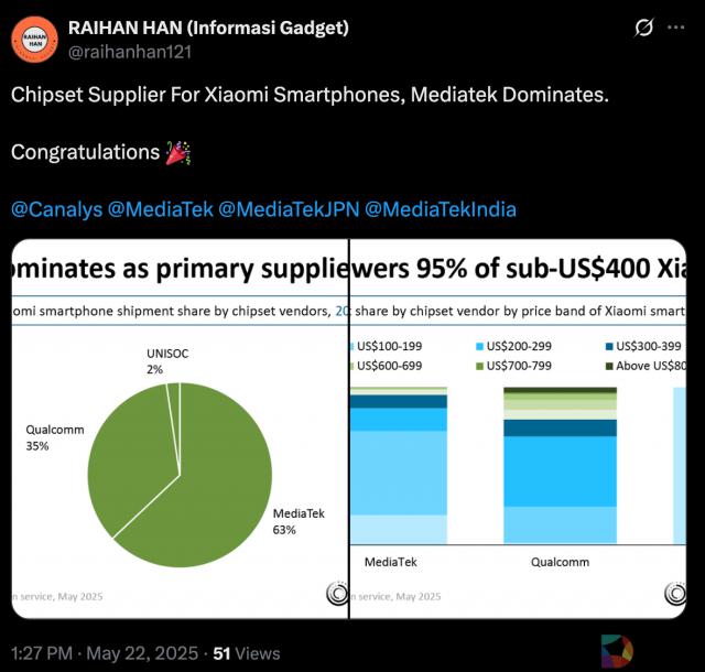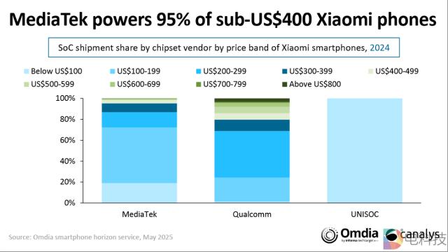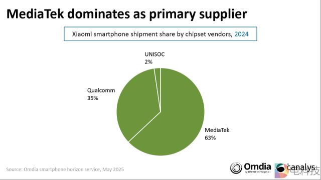 Omdia 公布的 Smartphone Tech 监控报告数据显示:2024 年年小米智能手机使用的 SoC 所有芯片都依赖于第三方供应商。