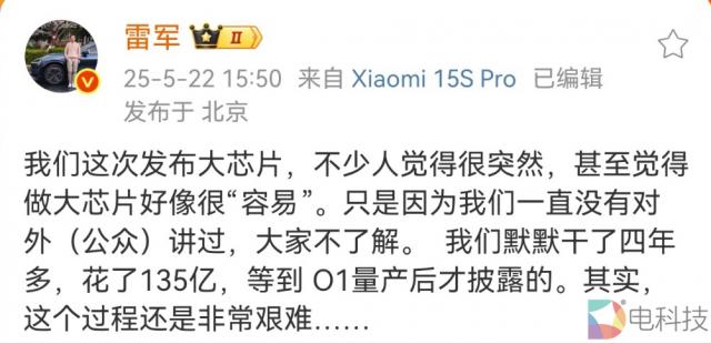 为今日发布,雷军提前两天在微博上发了一篇长文预热:“小米玄戒 O1,小米独立开发设计 3nm 旗舰芯片,已经开始大规模生产。