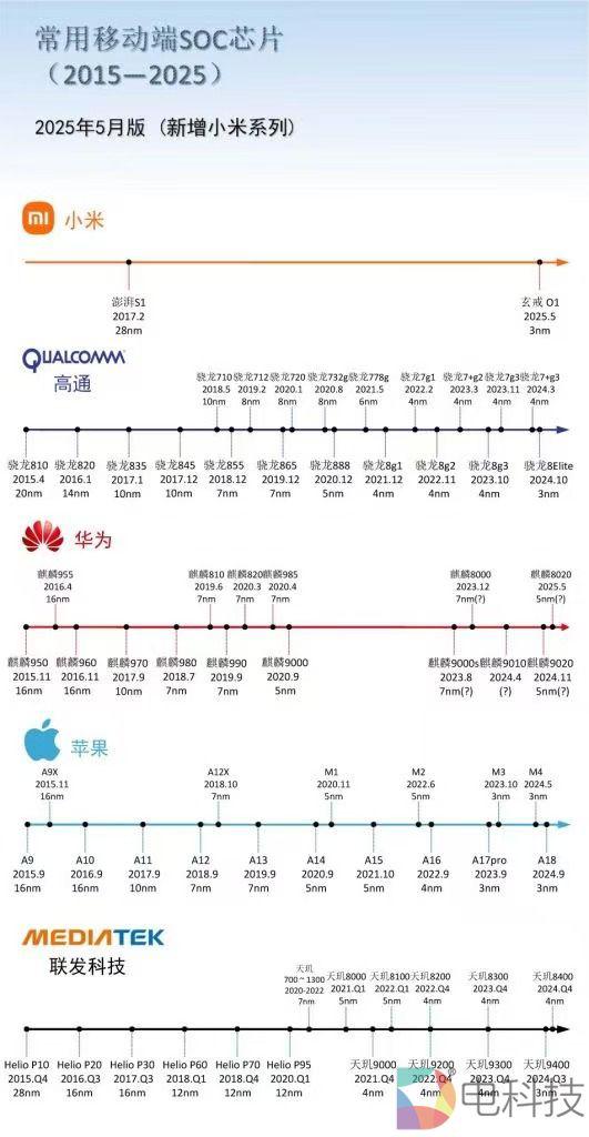 5 月 22 当天晚上,小米正式发布了首款旗舰芯片玄戒。 O1、首款长续航 4G 手表芯片玄戒 T1。玄戒 O1 台积电第二代芯片采用台积电。 3nm(即 N3E 工艺,和骁龙 8 至尊版 / 天玑 9400 / 苹果 A18 Pro 同样的工艺),整合 190 亿晶,芯片面积 109mm ²。