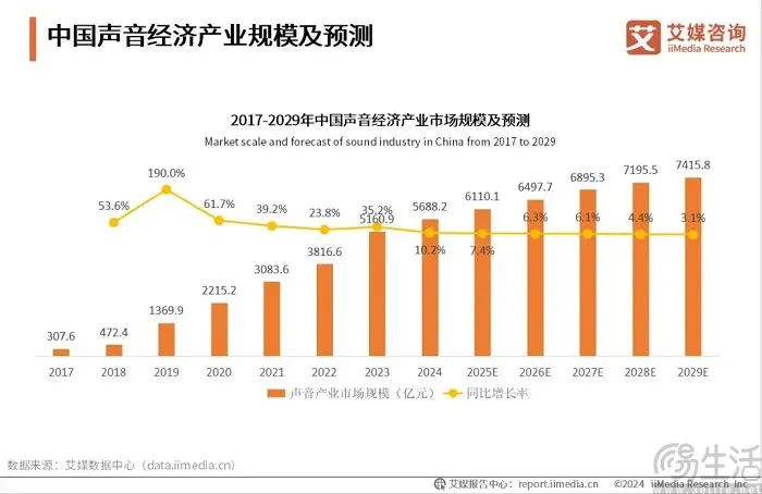 另外,音频内容本身也蕴含着巨大的经济价值。根据艾媒咨询的相关数据,2024年中国在线音频用户数量已达7.4亿,中国声音经济产业市场规模为5688.2亿元,预计2029年将超过7400亿元。