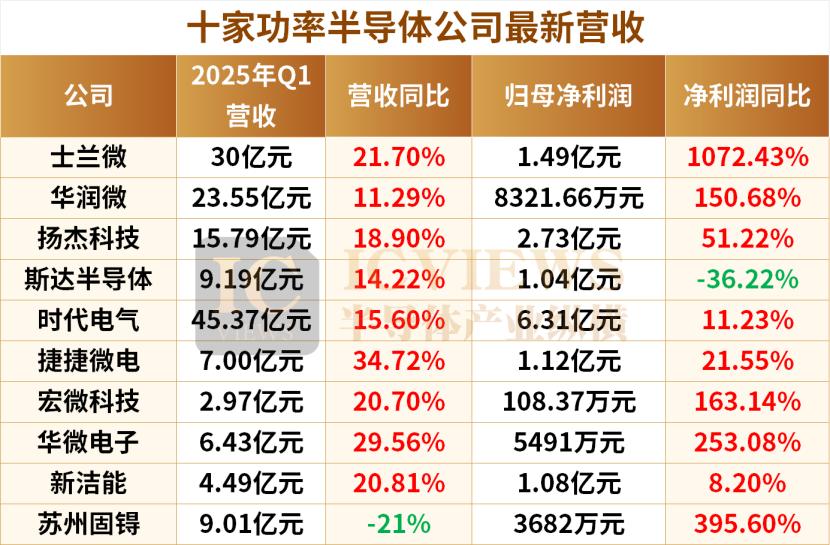 其中,最引人注目的表现是士兰微。报告显示,第一季度士兰微营业收入为30.00亿元,同比增长21.70%;归母净利润为1.49亿元,同比增长1072.43%;扣除非归母净利润为1.45亿元,同比增长8.96%;基本上每股收益0.09元。华润微,宏微科技,华微电子,苏州固定?同时也实现了三位数归母净利润同比增长。