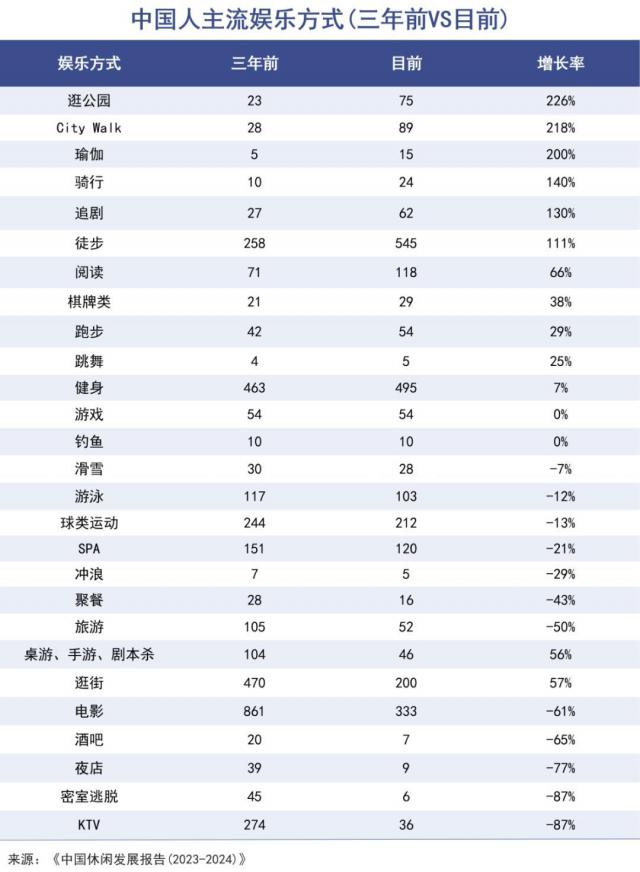 近日,社交平台上广为人知的一张名为“三年前中国主流娱乐模式和当前参与人数”的图表,数据来源于《中国休闲发展报告(2023-2024)》。