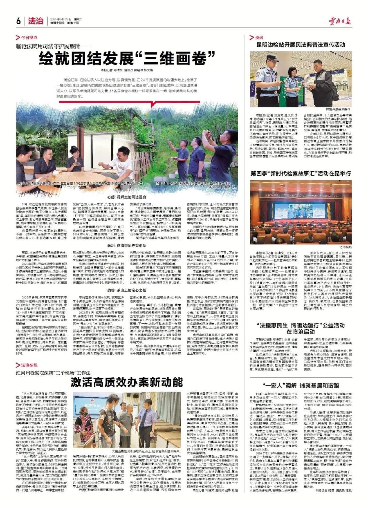 澜沧江畔,临沧法院人以法治为笔,以真情为墨。在24个民族生活的边境大地上,他们画出了一幅温暖、甜美、芬芳的民族团结发展“三维画轴”。法官们跋山涉水,用司法温暖渗透人心,用平凡的点点滴滴凝聚司法力量,让各民族像石榴籽一样紧紧地拥抱在一起,推动美丽与共的美好愿景照进现实。