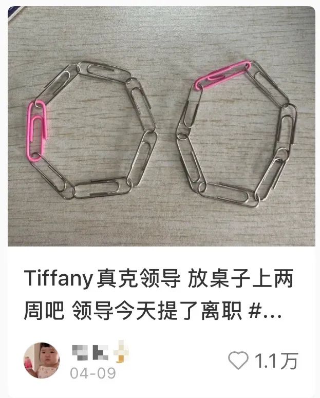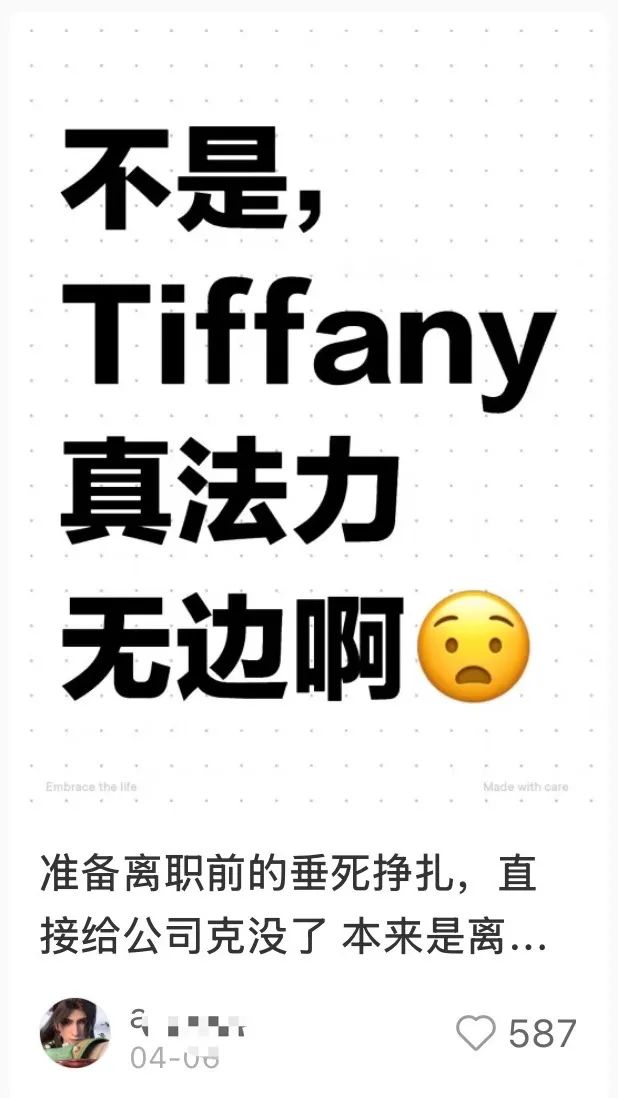 年轻人在网上饶有兴趣地交流具体风格、佩戴位置、模仿差异的使用细节和效果差异。他们真诚地在没有时间和地点的情况下阅读这种形而上学是有效的。Tiffany 成为这个职场发泄选择的意外媒体。