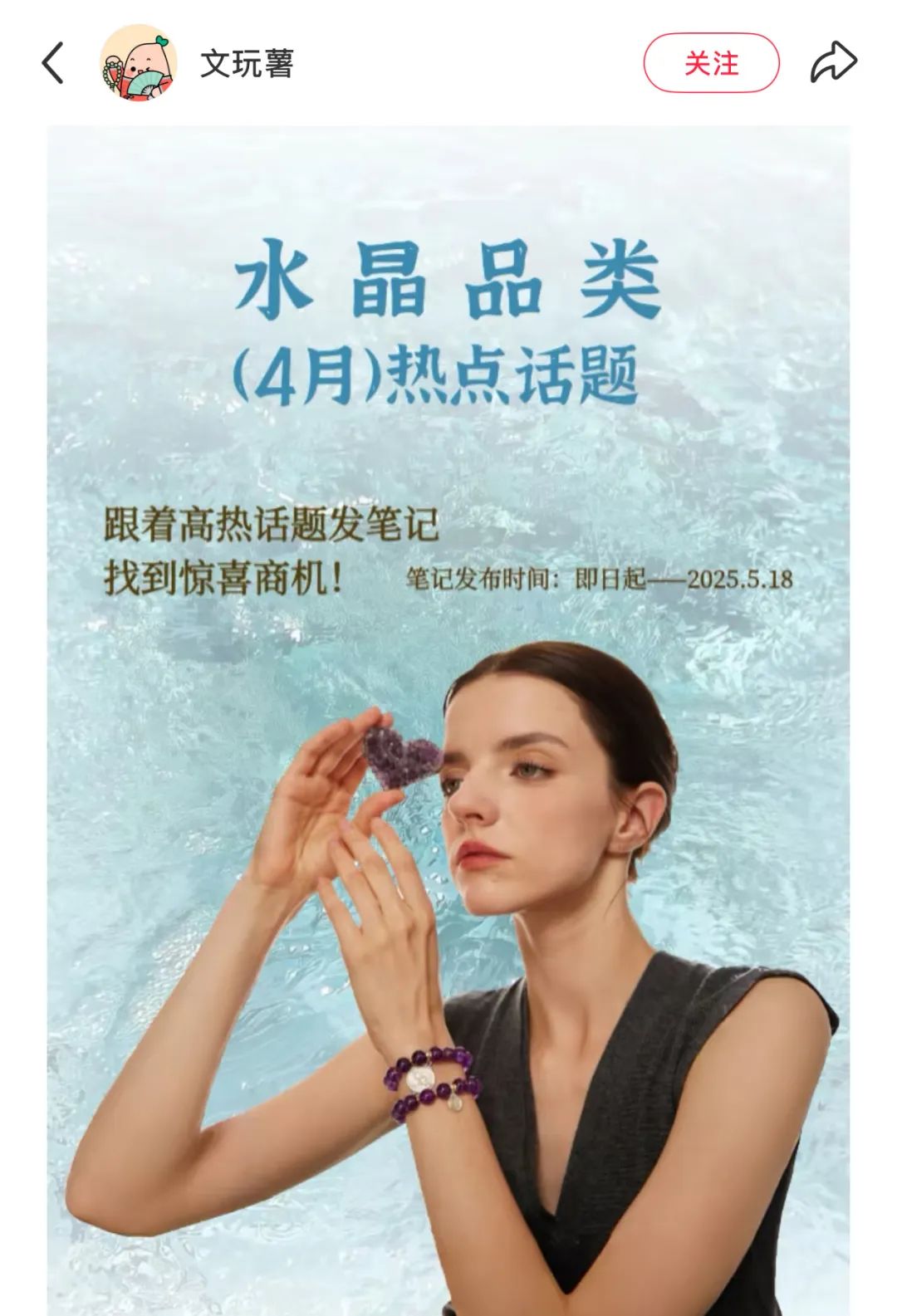 四月至五月,小红书官方帐号@文玩薯推出互动活动,针对#水晶女孩#、#春暖花开的水晶色调#、#兔毛水晶#三大话题,平台流量会推荐高质量的笔记内容。很多新的小众品牌在相关话题的评论区积极互动,试图通过这种方式获得更多的曝光机会。