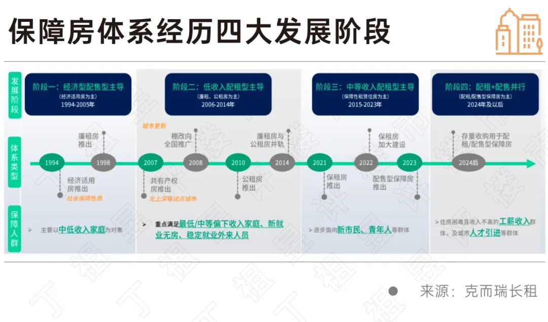 到目前为止,我国的保障房制度正式进入第四阶段“配租” 双轨并行配售方式。从第一阶段以经济适用房保障中低收入家庭,到第二阶段以廉租房和公租房的方式,将保障人群扩展到最低/中低收入家庭、新就业无房、稳定就业外来人员等。,到第三阶段以经济适用房保障租赁住房,面向中产阶级新市民和青年。现在“出租” “双轨并行配售方式”逐步扩大、移位保障群体,包括住房困难、收入低的工薪人群和城市人才引进等群体。