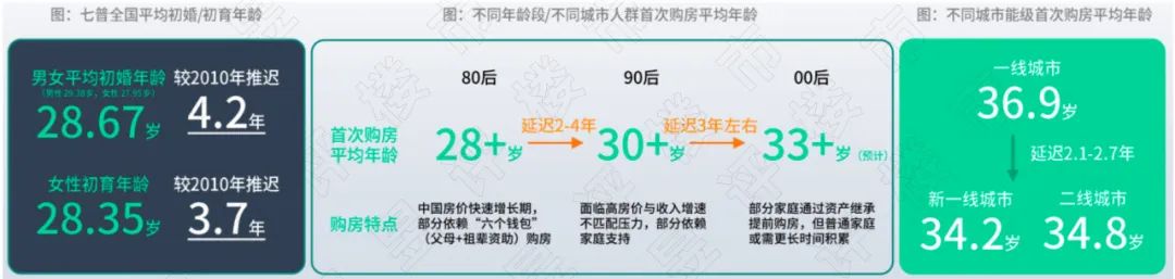 买房者的买房年龄正在推迟。从不同年龄首次购房的平均年龄来看,80后平均年龄超过28岁,90后超过30岁,00后估计超过33岁。