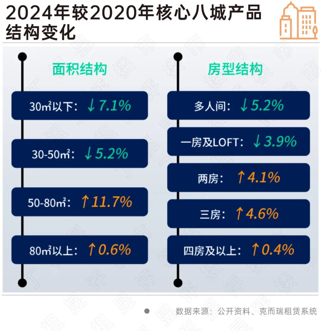 2020年至今,核心八城集中式公寓50㎡下列小型商品市场份额缩小12.3%,而50-80%。㎡商品市场份额增长11.7%,就户型而言,一房和LOFT市场总额收窄3.9%,两房和三房商品市场分别上涨4.1%和4.6%,这个行业已经从刚需过渡到大规模宜居商品。