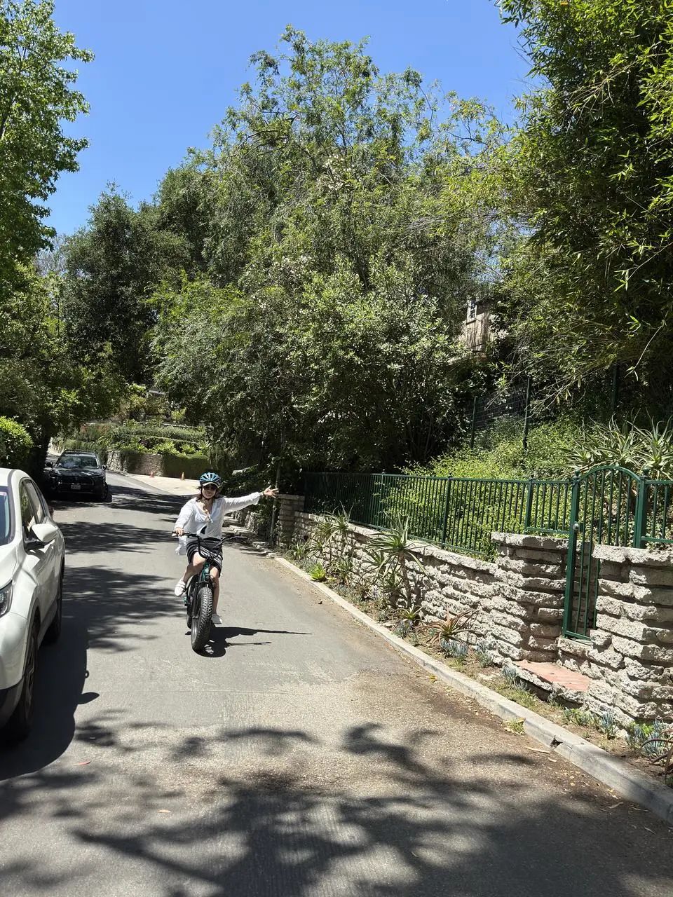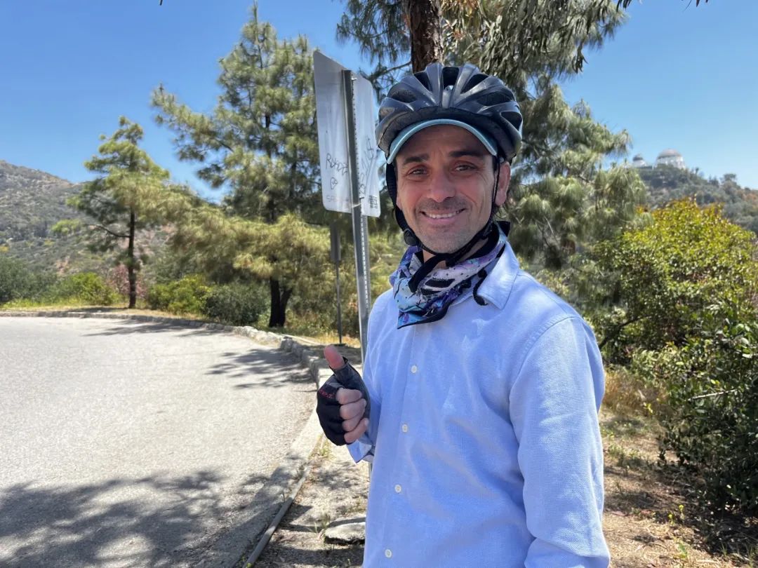 但是“死侍”Scott的另一面是,一路上,他非常严格地让我骑在他后面,无法超越他,更不能超速。他还教我如何把右腿放在路边,在合适的地方拍照,提醒我不要下车,只是在自行车上拍照。在通往格里菲斯天文台的山路上,不断有汽车飞驰而过。他会一边骑行一边用一只手举起一个V字,示意路过的车先过去。如果你看到其他骑自行车的人速度很快,跟得很紧,他会把这个人当成反面的典型——太危险了。
