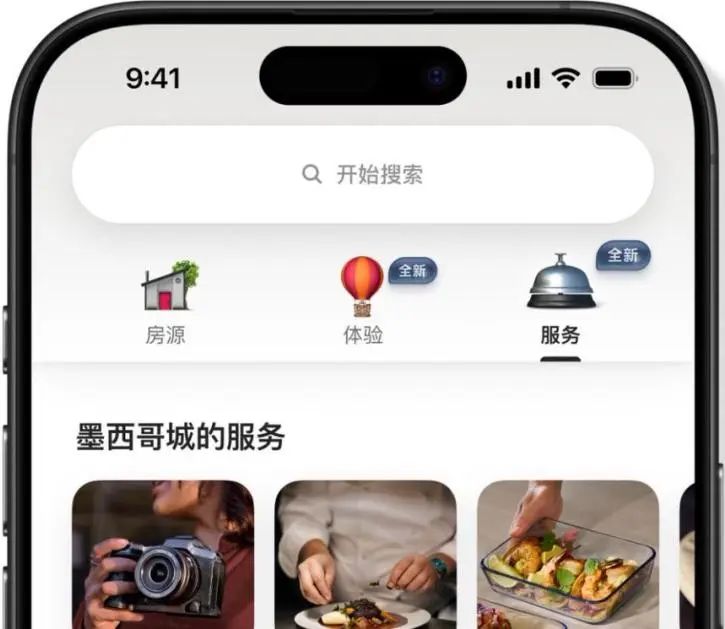 打开爱彼迎App,你可以看到上面一行的分类按钮,除了房子,还有另外两个:感觉和服务。