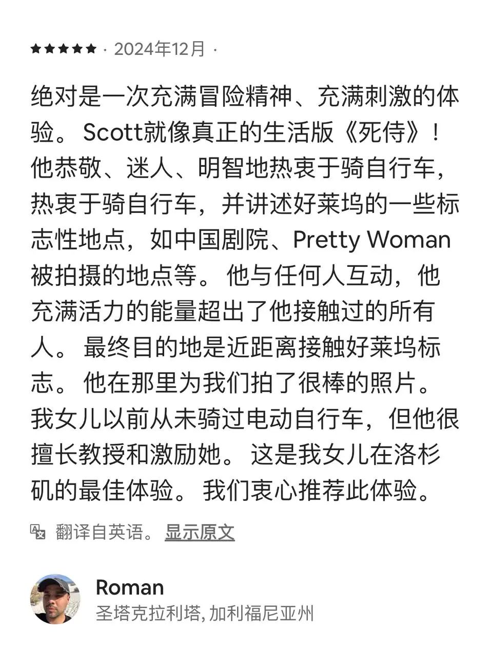 补充一下,前一天预定的时候已经快晚上10点了。我非常担心Scott已经“下班”了,错过了我预定的消息。然而,下单15分钟左右后,他通过App回复:“你选对了感觉!我爱洛杉矶,和你分享最好的一面。”
