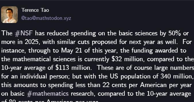 美国国家科学基金会(NSF)在 2025 一年之内,基础科学资金减少了一半以上,明年的预算草案也计划继续大幅减少。以数学科学为例,截至 5 月 21 今年这个领域只获得了资助。 3200 在过去的十年里,万美元的年平均水平是 1.13 亿美金。转换为人均,美国 3.4 亿人代表着,每个美国人每年在基础数学研究方面的投入还不够。0.22 美元,十年平均值为 0.80 美金。