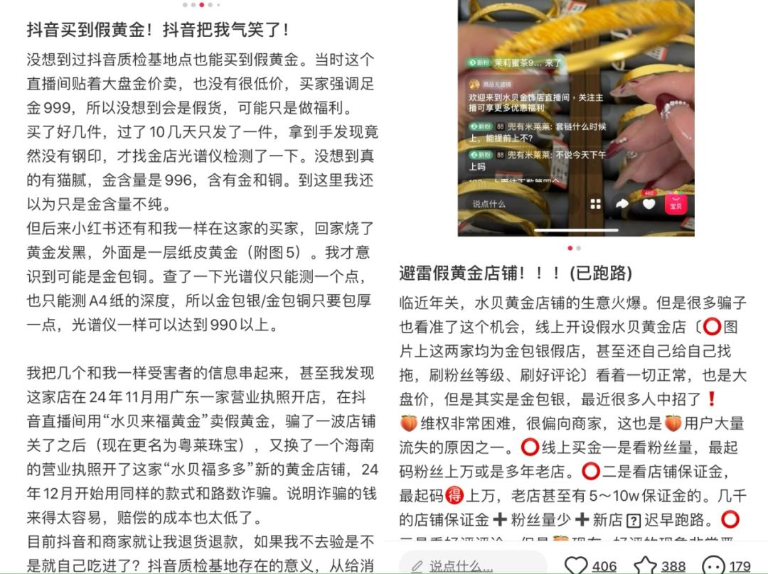 在小红书上,有网友发了一张笔记,说在一水贝金饰直播间花了13000多元买了假黄金。“我买的时候,主播强调整体黄金999,给我的验证证也是999。”但是如果点击商品详情页,材料却写得足银,就是商家确定一般不会点击看。而且在这篇笔记下,有网友评论说,“这家商店多次更换店名, “很多人都被这家店骗了”,一直没有被关…